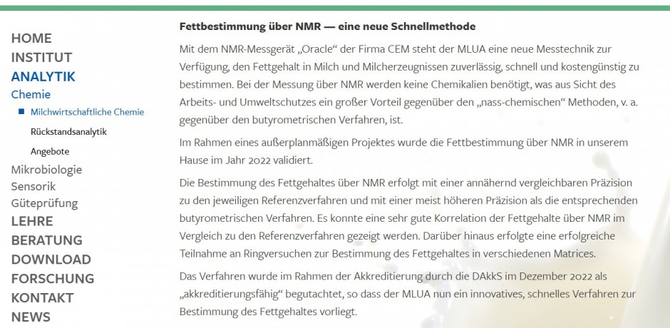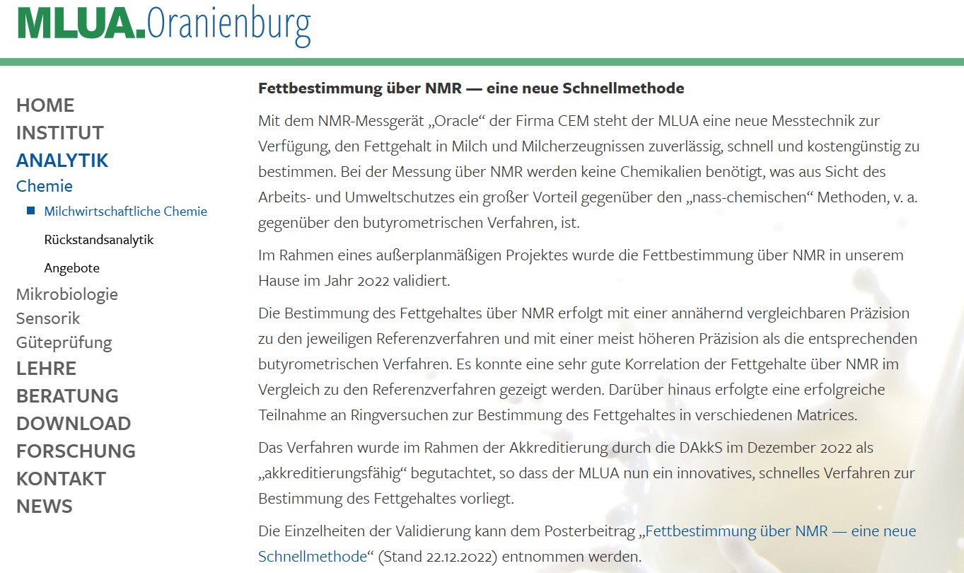 Mit dem NMR-Messgerät #ORACLE der Firma #CEM steht der #MLUA eine neue Messtechnik zur Verfügung, den #Fettgehalt in #Milch und #Milcherzeugnissen zuverlässig, schnell und kostengünstig zu bestimmen. Bei der Messung über NMR werden keine Chemikalien benötigt, was aus Sicht des Arbeits- und Umweltschutzes ein großer Vorteil gegenüber den „nass-chemischen“ Methoden, v. a. gegenüber den #butyrometrischen Verfahren, ist.