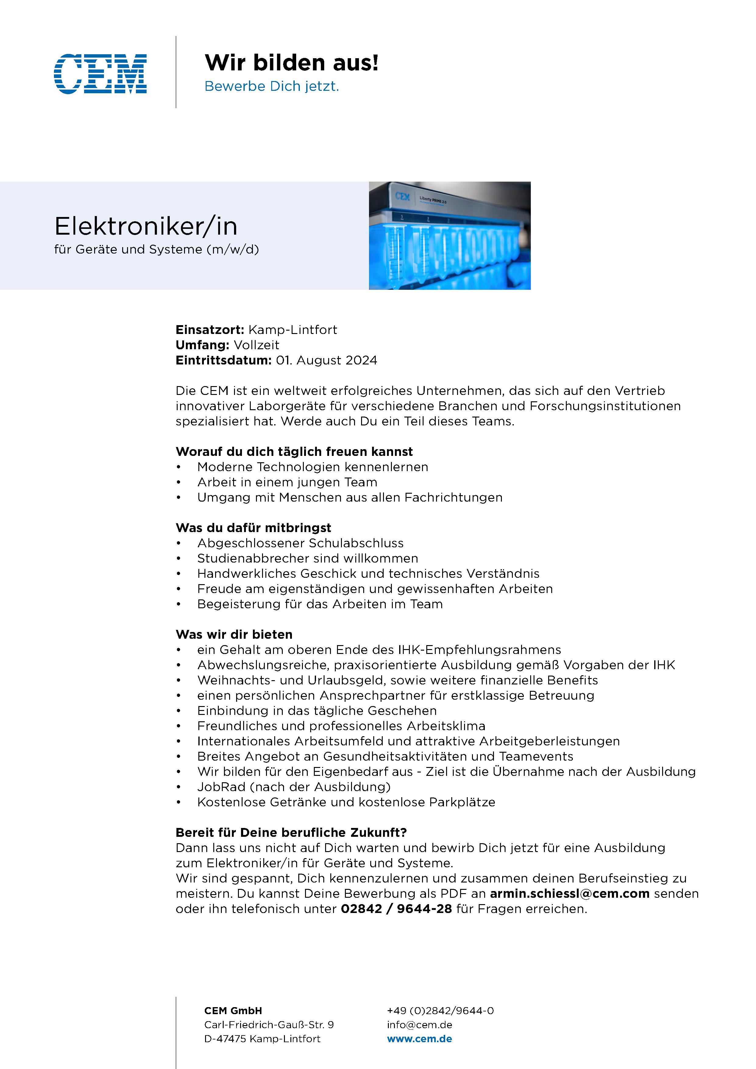 Dann lass uns nicht auf Dich warten und bewirb Dich jetzt für eine Ausbildung zum Elektroniker/in für Geräte und Systeme. Wir sind gespannt, Dich kennenzulernen und zusammen deinen Berufseinstieg zu meistern. Du kannst Deine Bewerbung als PDF an armin.schiessl@cem.com senden oder ihn telefonisch unter 02842 / 9644-28 für Fragen erreichen.