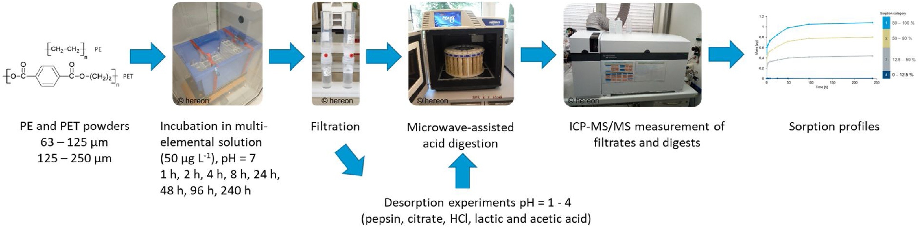 „Bei den Untersuchungen haben wir festgestellt, dass die Anreicherung umso stärker ist, je kleiner die Partikel sind und dass es signifikante Unterschiede zwischen den verschiedenen Elementen (Metallen und Halbmetallen) gibt, was das Ausmaß der Anreicherung betrifft“, sagt Co-Autor Dr. Daniel Pröfrock, Leiter der Abteilung Anorganische Umweltchemie am Hereon. Einige Metalle, genauer gesagt deren Ionen, wie zum Beispiel Chrom, Eisen, Zinn und die Seltenen Erden, lagerten sich fast vollständig an das Mikroplastik an. Andere, wie beispielsweise Cadmium, Zink und Kupfer, zeigten über die gesamte Versuchszeit nahezu keine Anlagerung am Plastik. Dazu kommt, dass die Polyethylen-Partikel eine deutlich stärkere Anreicherung aufwiesen als die Polyethylenterephthalat-Partikel.